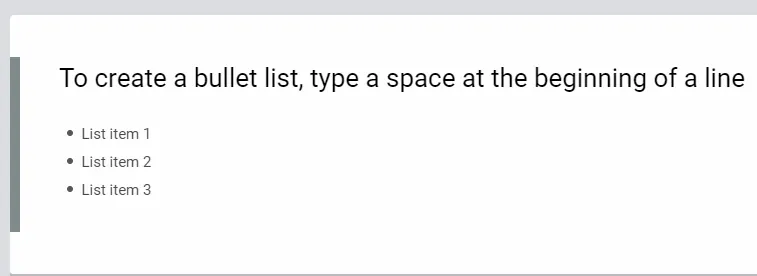 By typing a space at the beginning of a line, you can create a bullet list; pressing Enter will automatically move to the next bullet list. If you want to stop bulleting, press the Enter key twice.