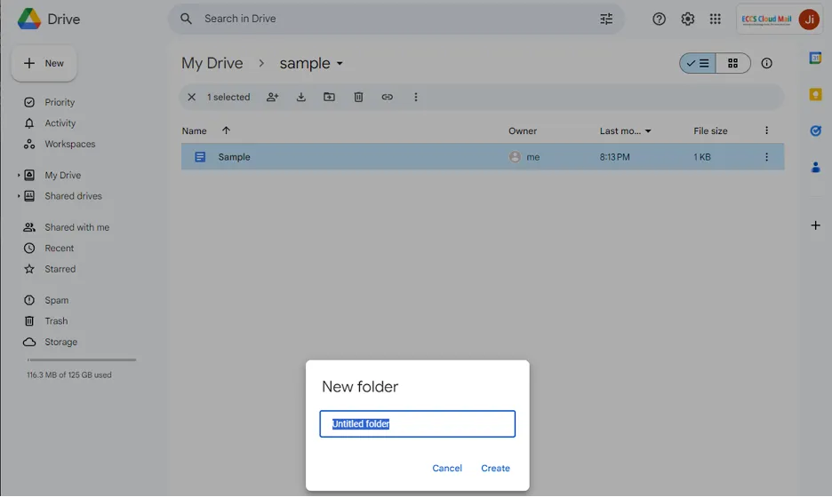 To proceed with the following steps, make sure you are already logged into ECCS Cloud Mail and have Google Drive open in your browser. If you have not completed these two steps, please refer to “Open Google Drive in the browser” on the Google Drive page (an English translation is planned).