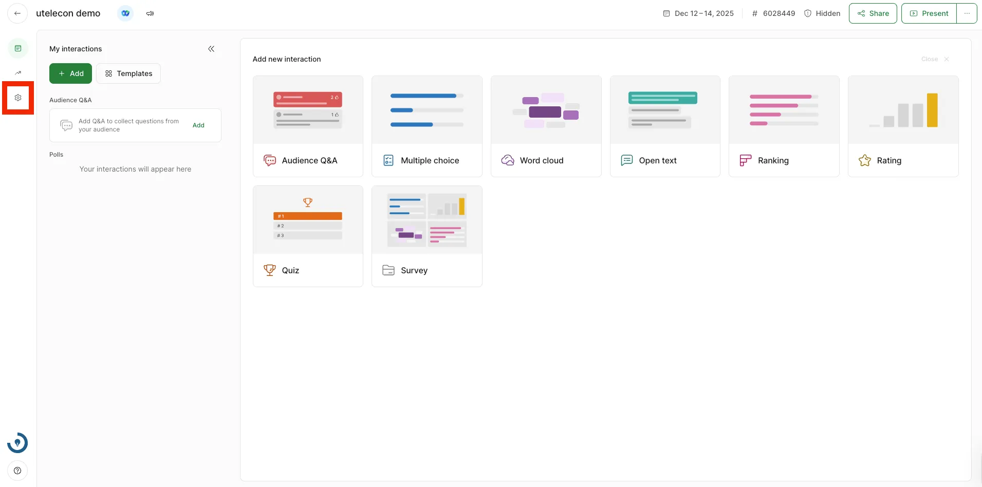 When Slido is used with a University of Tokyo account, users are eligible for advanced event settings that are unavailable in free accounts. The settings can be changed by selecting “Settings” in the upper-left corner of the event host’s screen. The host screen can be accessed from the event list page.