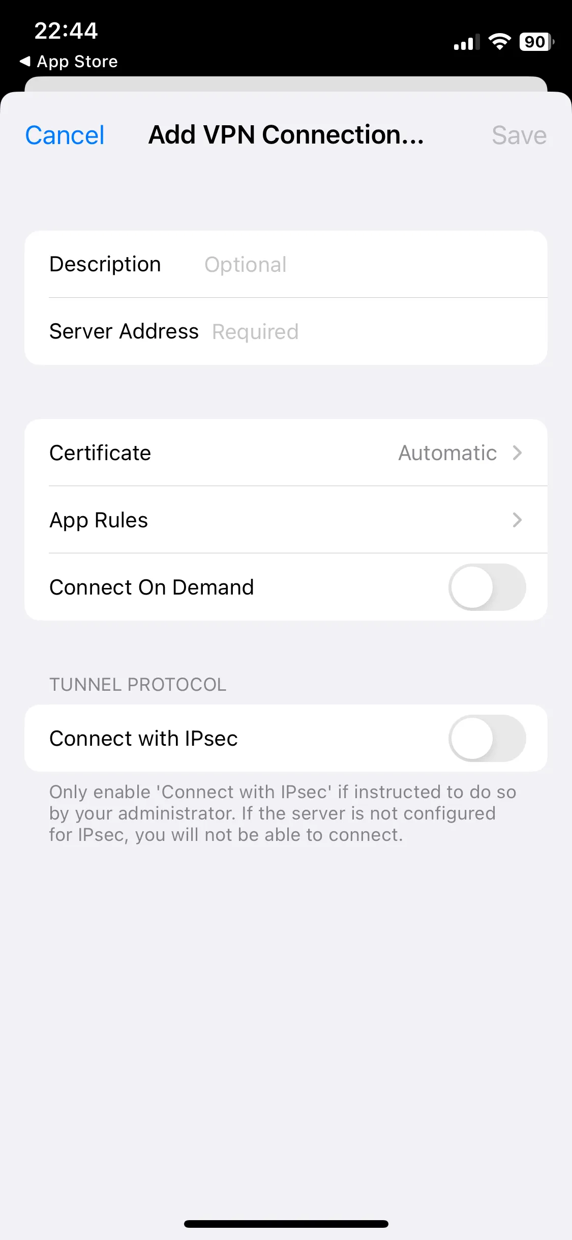 Step C: Tap “Connections” on the screen after launching the application, and then tap “Add VPN Connection…” on the subsequent screen. The following screen will then appear. Tap the input field next to “Server Address” and enter vpn1.adm.u-tokyo.ac.jp.