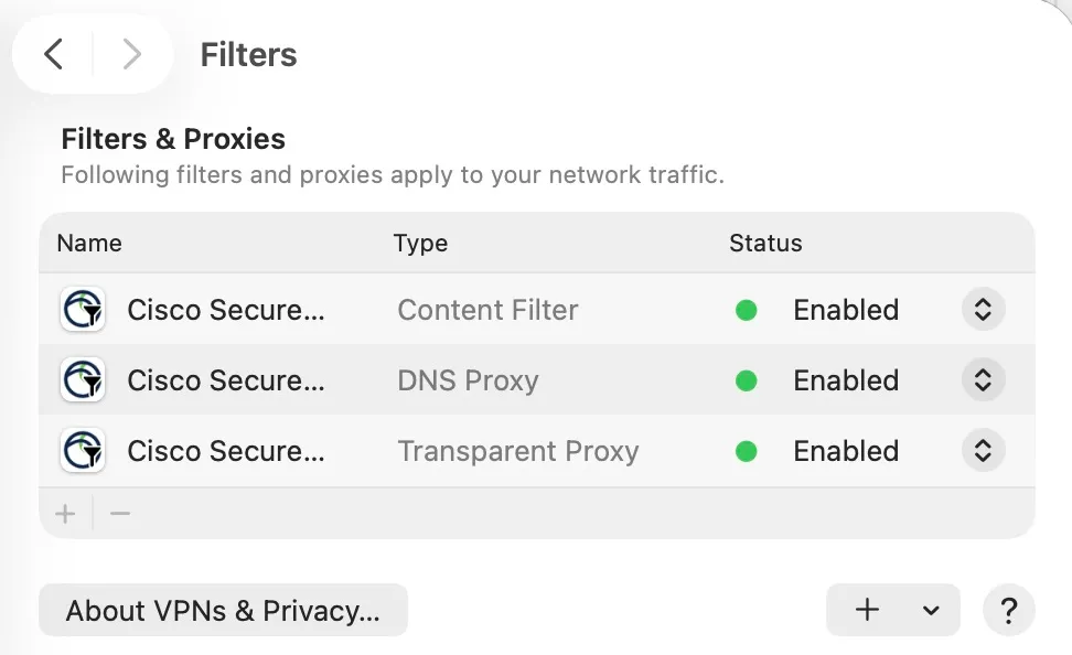Note: After installing the Cisco Secure Client application on a macOS 11 Big Sur or later, three extensions with the name “Cisco Secure Client Socket Filter” are added to the “Filter” (or the “VPN & Filter”) in “Network” in “System Settings”. These extensions are necessary for shifting networks between VPN and others such as Wi-Fi or LAN. They do not record the contents of communications or send the information outside the host. These extensions’ statuses are always “connected (green dot)” regardless of a real connection to the UTokyo VPN.