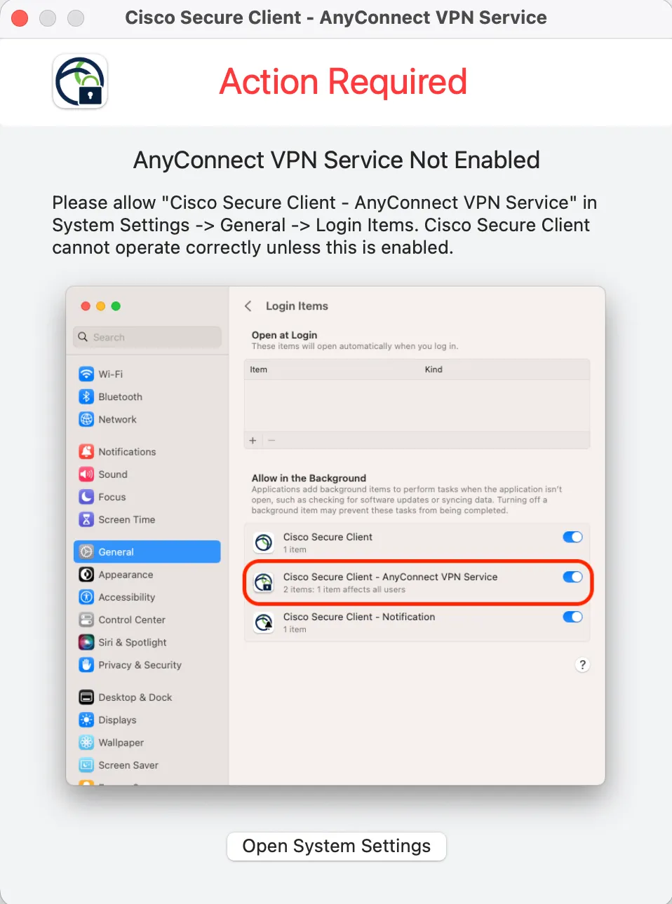 Please access this page and try downloading.Step C: During the installation of Cisco Secure Client, a window with the following message “Action Required AnyConnect VPN Service Not Enabled” may appear. Please follow the instructions to allow the system software from “Cisco Secure Client - AnyConnect VPN Service”, which is displayed in the “App Background Activity” in “Login Items & Extensions” in “General” in “System Settings”. When a window with the following message ‘“Cisco Secure Client - Socket Filter” would like to use a new network extension’ appears, please click the “OK” button.