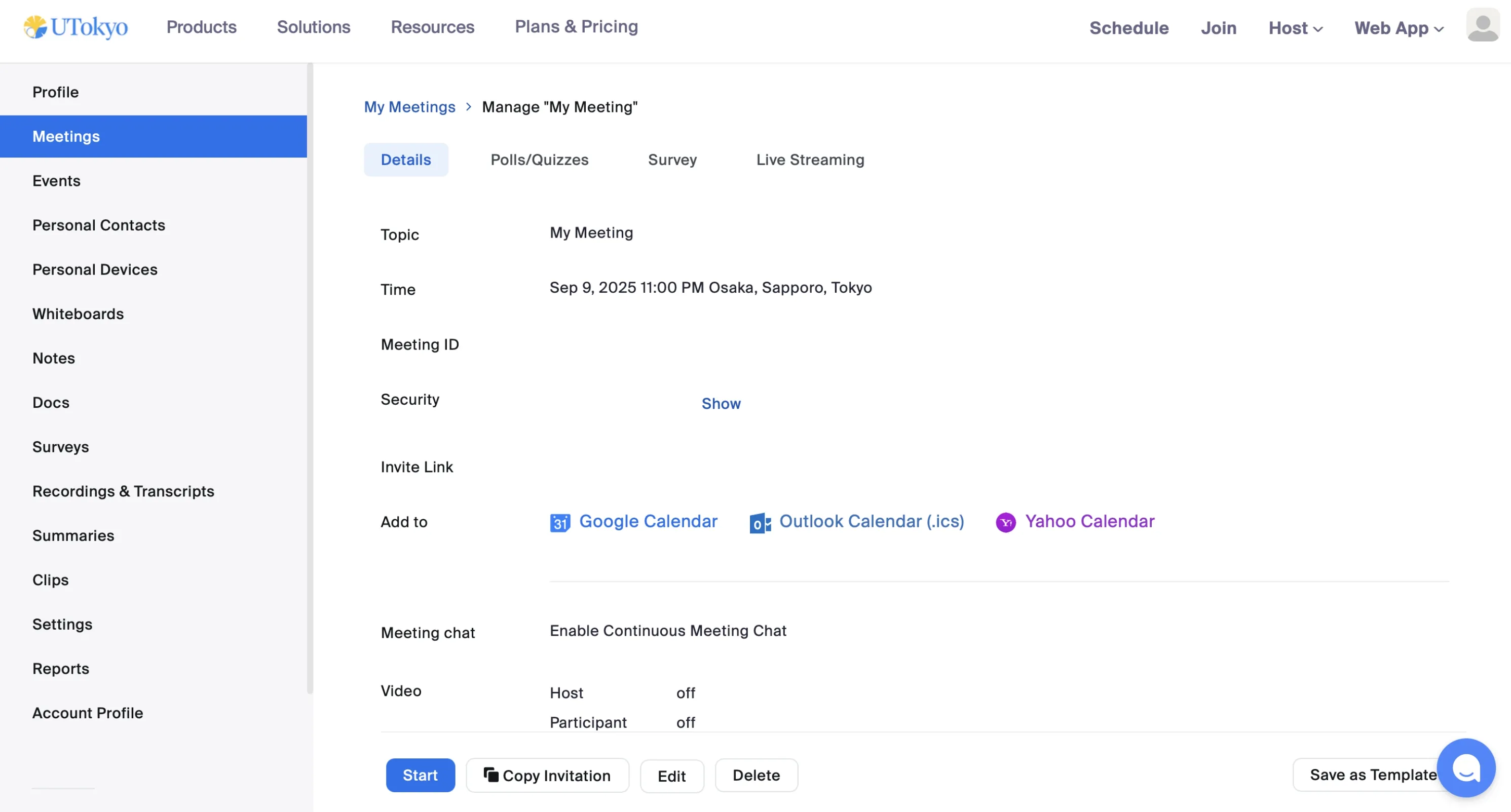 - On the other hand, if you click the meeting title itself, the Manage “My Meeting(This is where the name of the meeting you scheduled will be inserted)” screen appears.