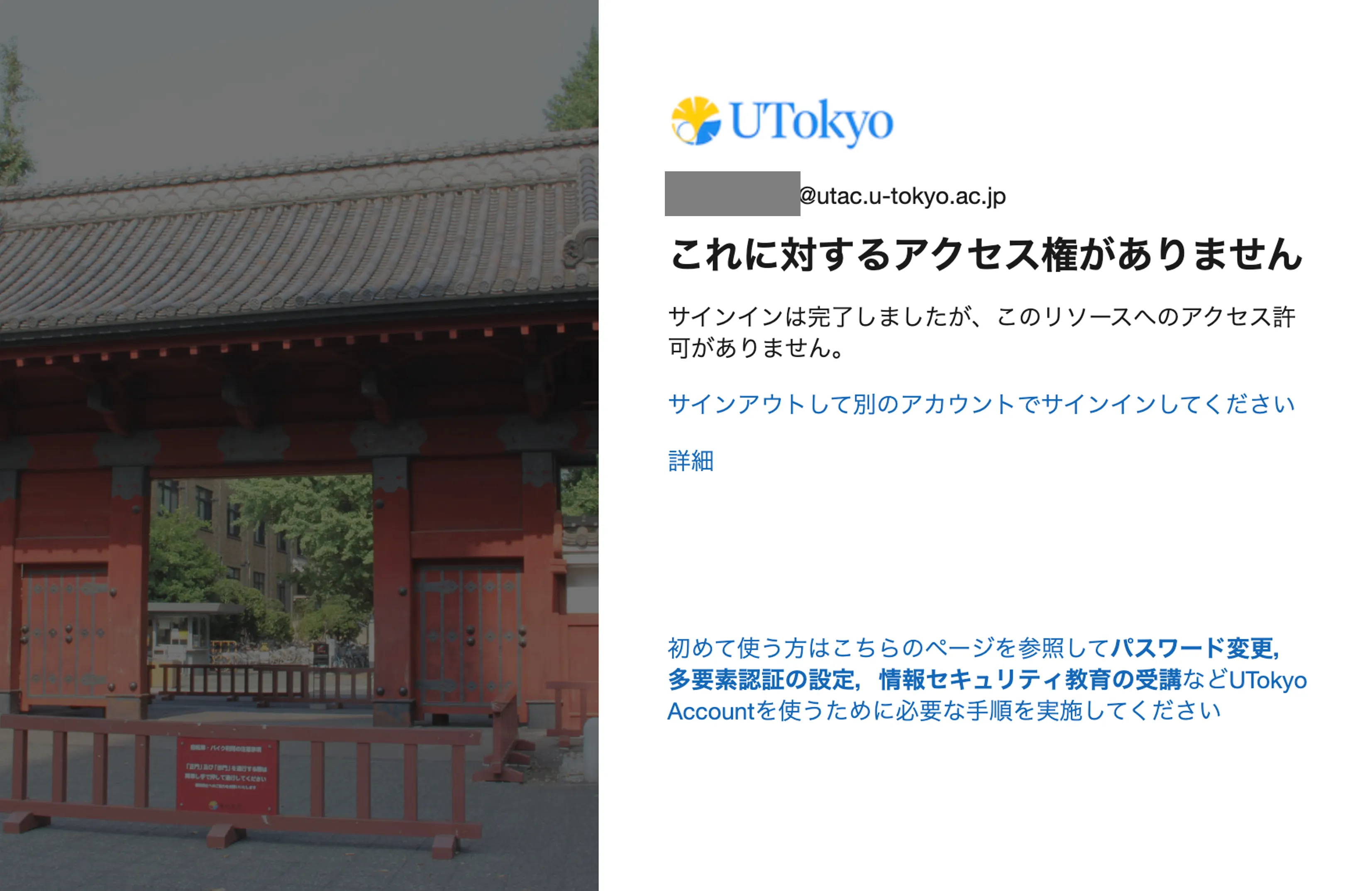 - UTokyo Accountパスワード通知書を受け取り,初期パスワード変更の操作をしようとすると,「これに対するアクセス権がありません」「サインインは完了しましたが,このリソースへのアクセス許可がありません」などと表示されて先に進めない.