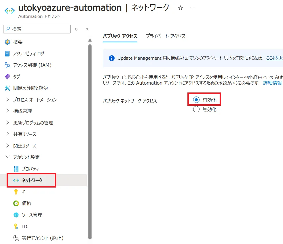 前項のネットワークパートでパブリックアクセスを選択していた場合,作成された Automation アカウントのパブリックアクセスが無効化されていると実行に失敗するため,有効化します.