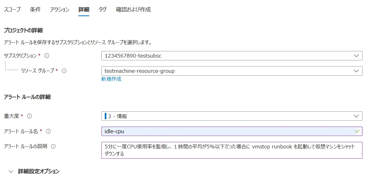 3.情報のままで問題ありません. - アラートルール名:監視リソース名になります.自由に設定可能ですがここでは