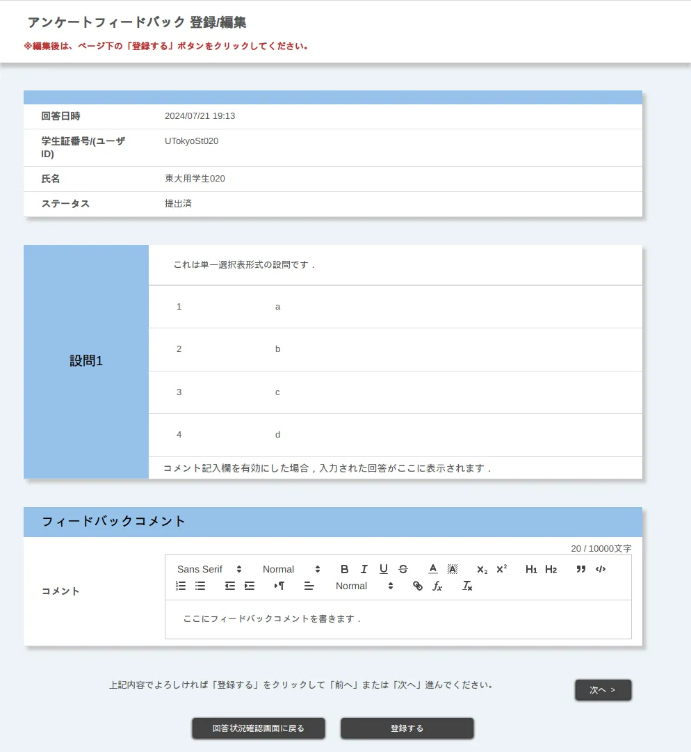 - フィードバックコメントを登録する場合は,「フィードバックコメント」欄にコメントを入力し,「登録する」を押してください.